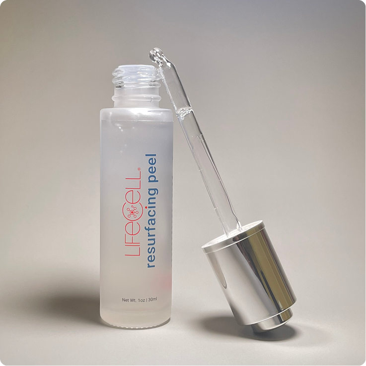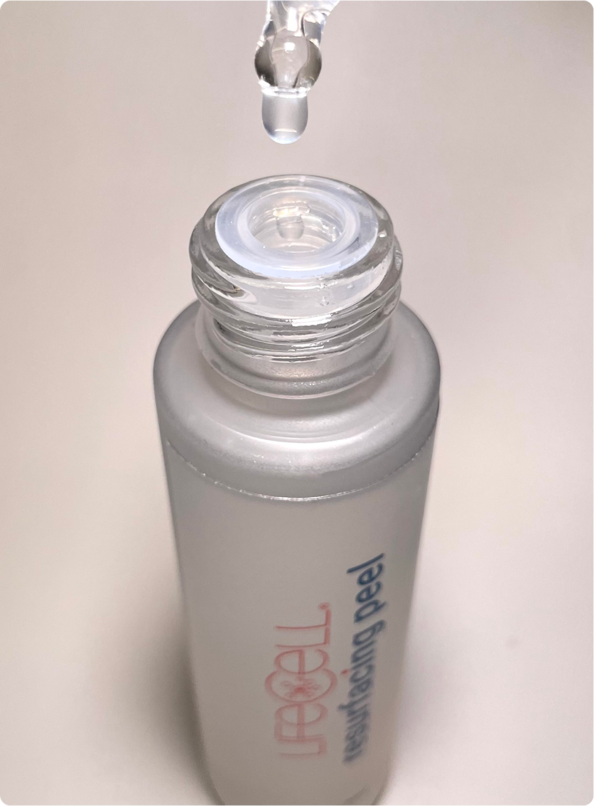 LifeCell Resurfacing Peel es un exfoliante líquido con una potente mezcla de 10% AHA (7% ácido láctico + 3% ácido glicólico), diseñado para disolver células muertas, limpiar poros y revelar una piel visiblemente más suave y luminosa en solo 7 días.